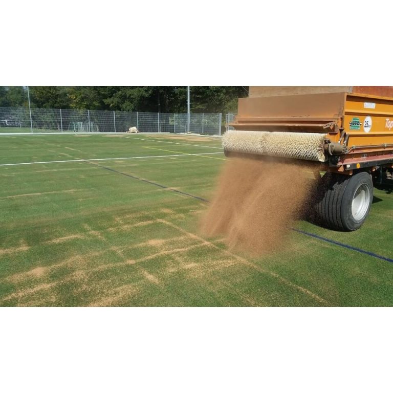 Bei einer Nachfüllmenge von 1.500 kg ergibt sich rechnerisch eine Fläche von ca. 2.700 m², abhängig von Füllhöhe, Platzaufbau und Zustand des vorhandenen Kunstrasens.